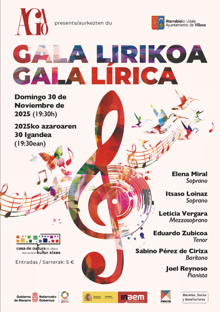 Un año más, AGAO, en colaboración con el Ayuntamiento de Villava / Atarrabiako Udala, presenta un precioso concierto en el que solistas de la asociación, acompañados al piano, ofrecerán un programa con arias y dúos de óperas y zarzuelas muy conocidas.