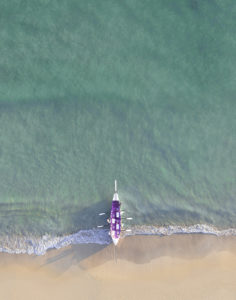 Aerial shot of a purple boat on a beautiful shore under the sunlight
